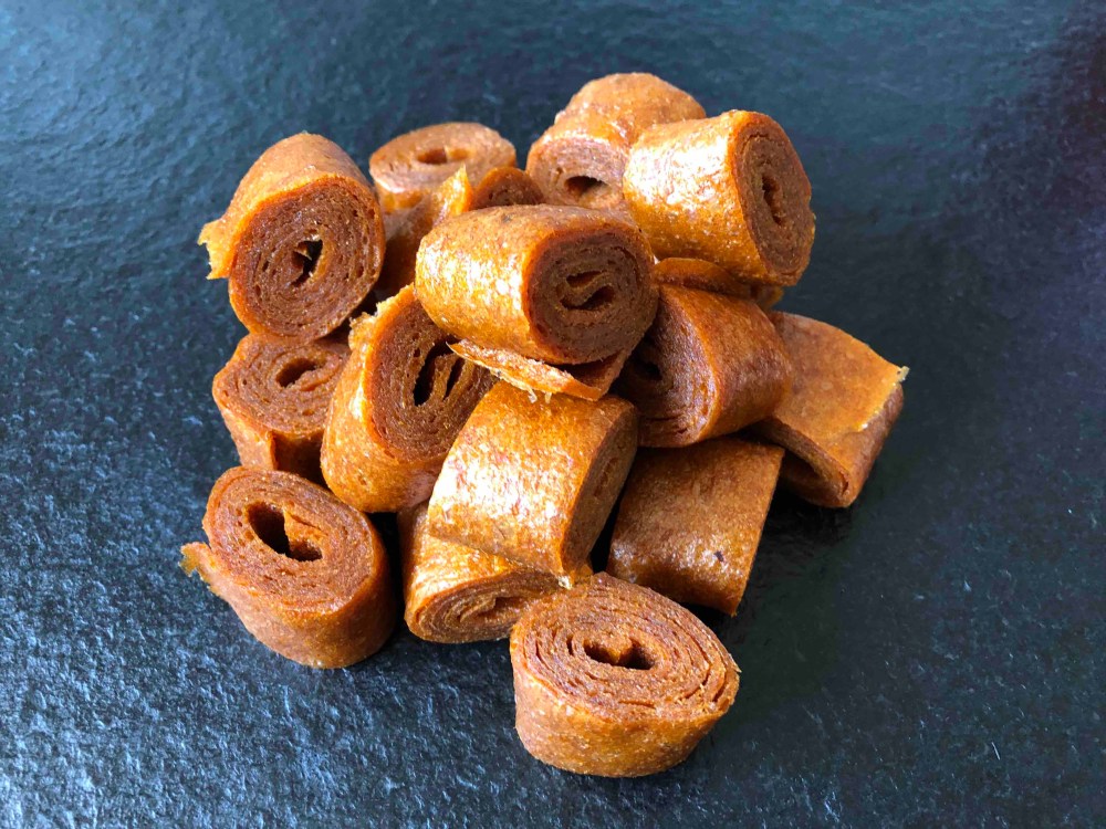 Cover and blend until fully puréed. Pour onto a 14″ x 16″ silicone baking sheet with ridges and smooth with a spatula to fill the sheet evenly. Dry for 36 hours at 120°F/50°C in a convection oven. Peel the dried leather off the baking sheet, roll it up, then slice into pieces. Store in Ziploc bags.